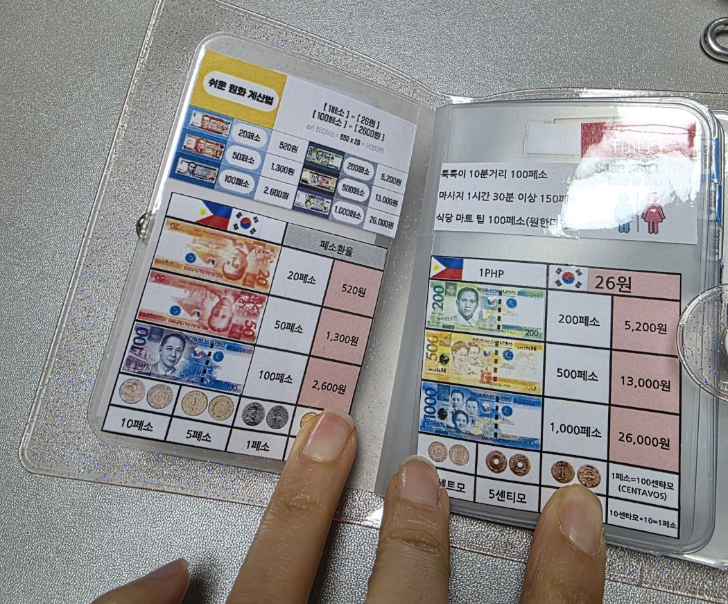 저는 반으로 잘라서 양옆에 오도록 위치 시켰고, 한장한장 넘기면서 페소를 확인할 수 있게 부착해 두었습니다.