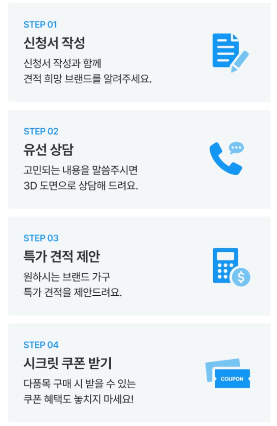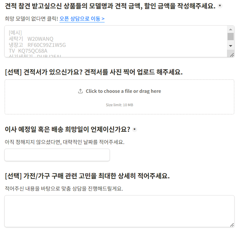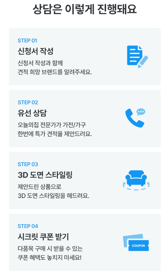 간단한 인적사항을 작성하시고, 가전만 상담받을지, 가구만 받을지, 가전가구 두개다 할지, 선택하실 수 있습니다.